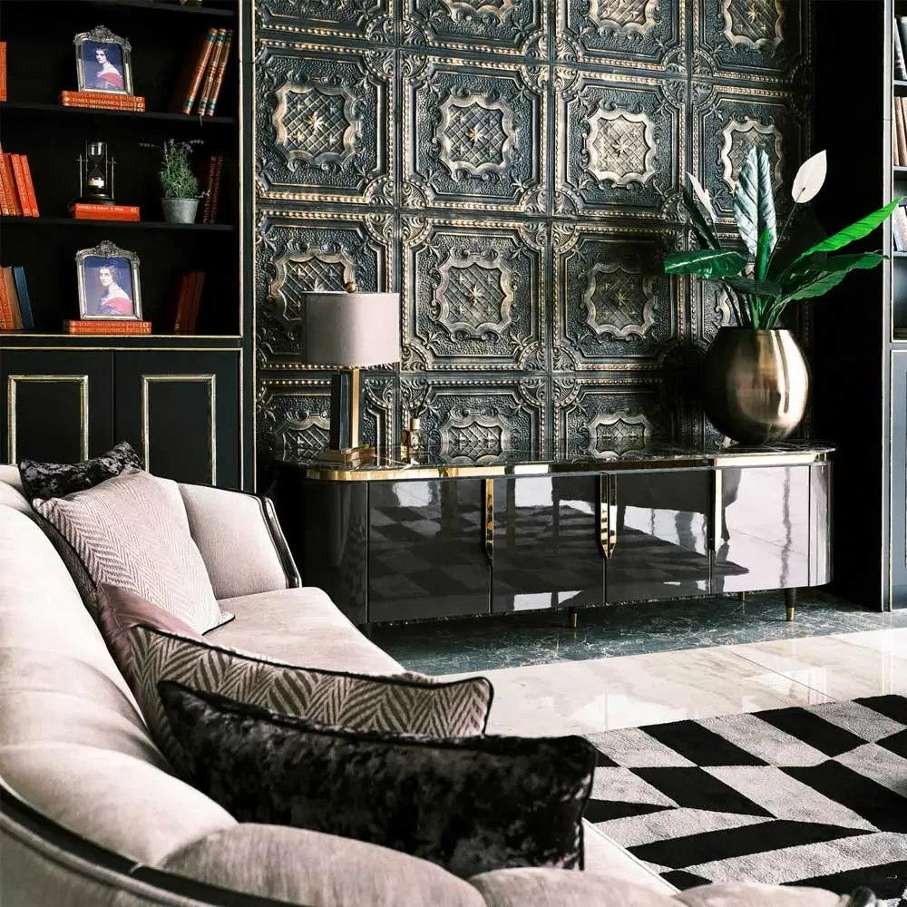 This TV unit, with its sophisticated design, adds a touch of luxury to any space. It measures 240 cm in width, 52 cm in height, and 50 cm in depth, providing ample space for entertainment devices and decorative items. Made from high-quality materials including natural wood, marble, and stainless steel details, it ensures durability and long-lasting elegance. The beige and black color combination offers an attractive contrast, making it versatile enough to complement various decor styles.