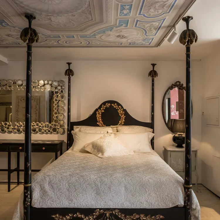 Black roma queen size bed with laurel crown