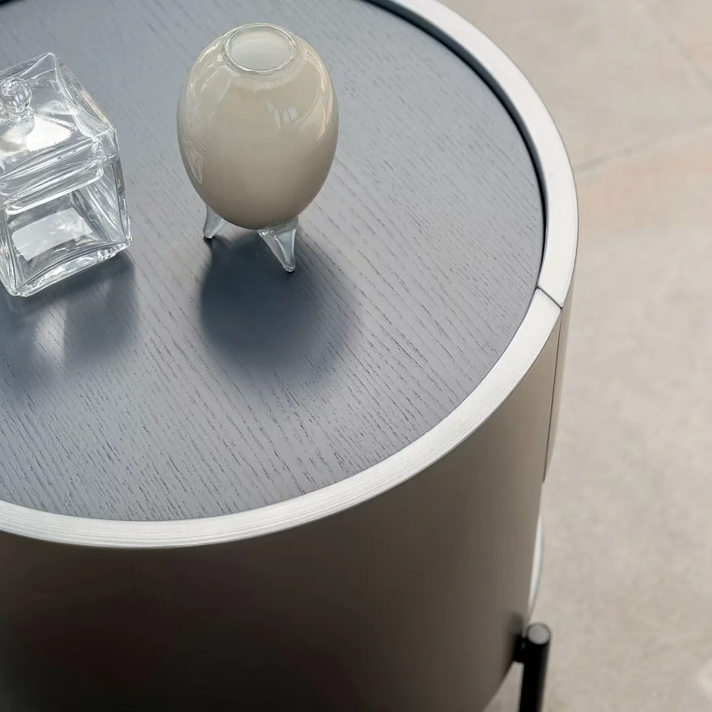 A luxurious modern nightstand that seamlessly combines elegance and functionality. Crafted from high-quality natural wood with durable metal accents, it features a sophisticated gray color with black touches, adding a modern and striking charm to any bedroom. With balanced dimensions of 48 cm (width) x 48 cm (depth) x 53 cm (height), it offers an ideal space for storage and displaying small items. Its contemporary design makes it a standout piece that enhances the interior décor with a touch of luxury and refined taste.