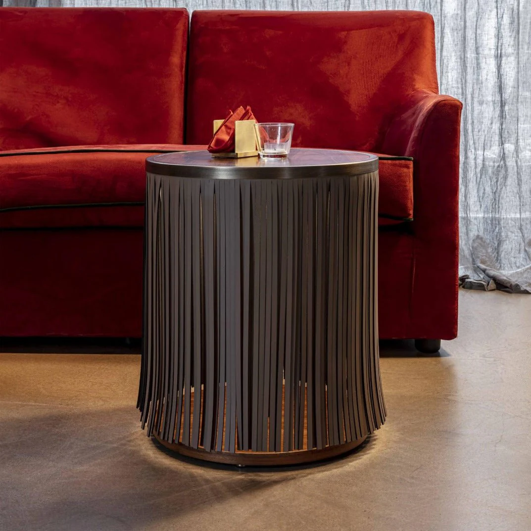 Indian ash side table with gray leather fringe
