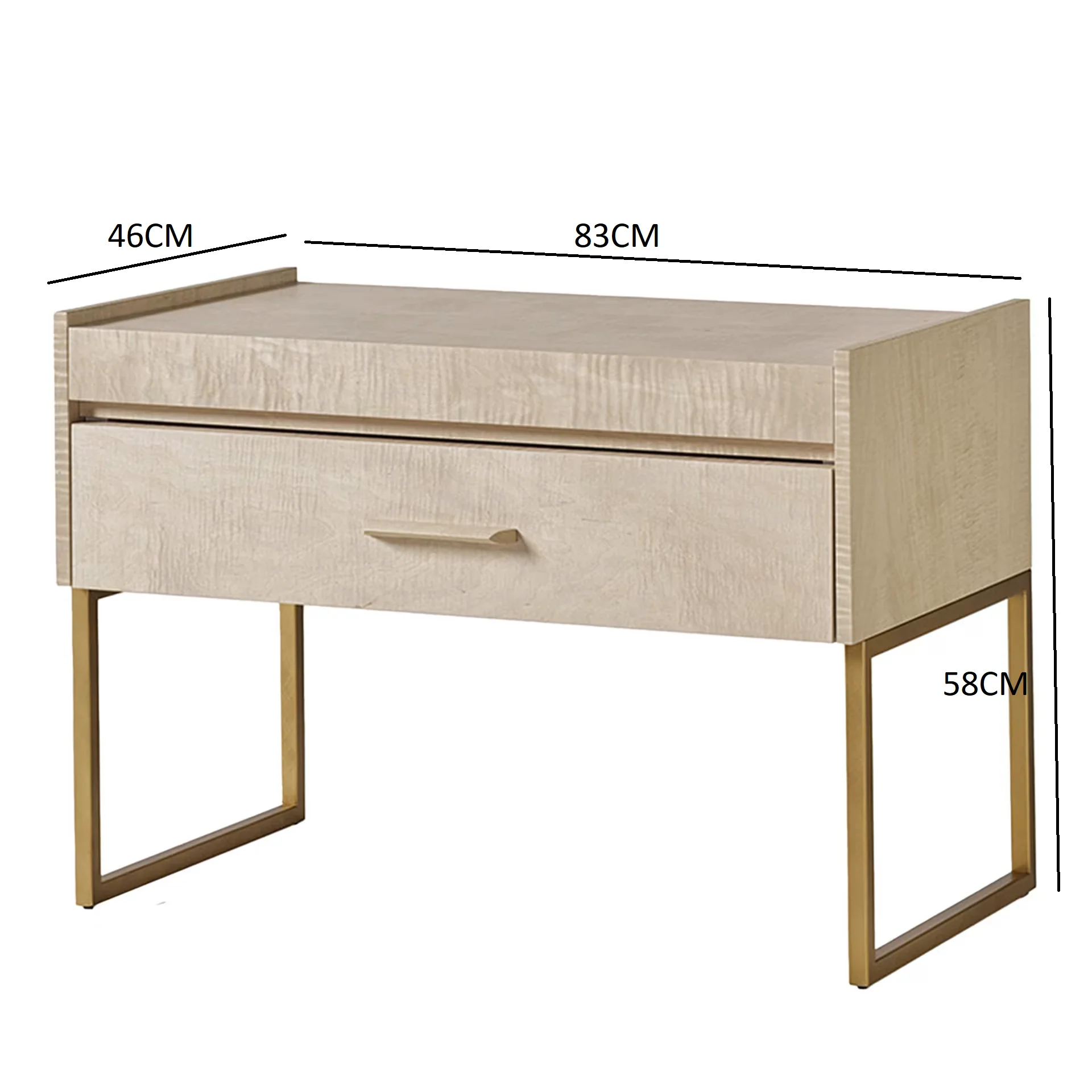 This large side table adds a touch of elegance to any space. With dimensions of 83 cm (width) x 46 cm (depth) x 58 cm (height), it provides ample space to display decorative items or for everyday use. Made from high-quality natural wood with metal details, it combines durability and beauty. The design features a beige color with golden accents, adding a luxurious and contemporary touch to your home decor.