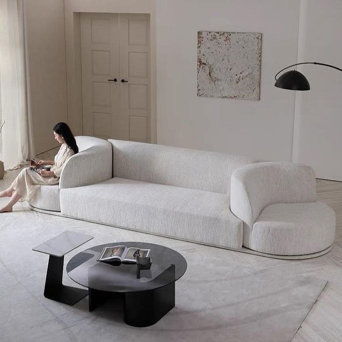 A versatile sofa that combines practical design with modern luxury, making it perfect for meeting various needs in spacious areas. It features an elegant white color that brightens up any decor. Available in multiple sizes: 200 cm, 300 cm, and 340 cm in width, with a height of 72 cm and a depth of 100 cm, making it adaptable to all spaces. Crafted from sturdy natural wood and premium bouclé fabric, it offers the perfect blend of durability and comfort. Its unique design makes it an ideal addition to any living room.